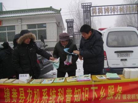 1月19日,镇赉县农机局科技服务队随同县科技局组织的科技之冬活动,深入到莫莫格乡集市上,利用农民赶集的时机,向农民广泛宣传农机科普知识,开设咨询台接受农民在农机方面的科普咨询。当天,接受农机科普知识咨询500余人(次),发放农机科普资料10000余份。